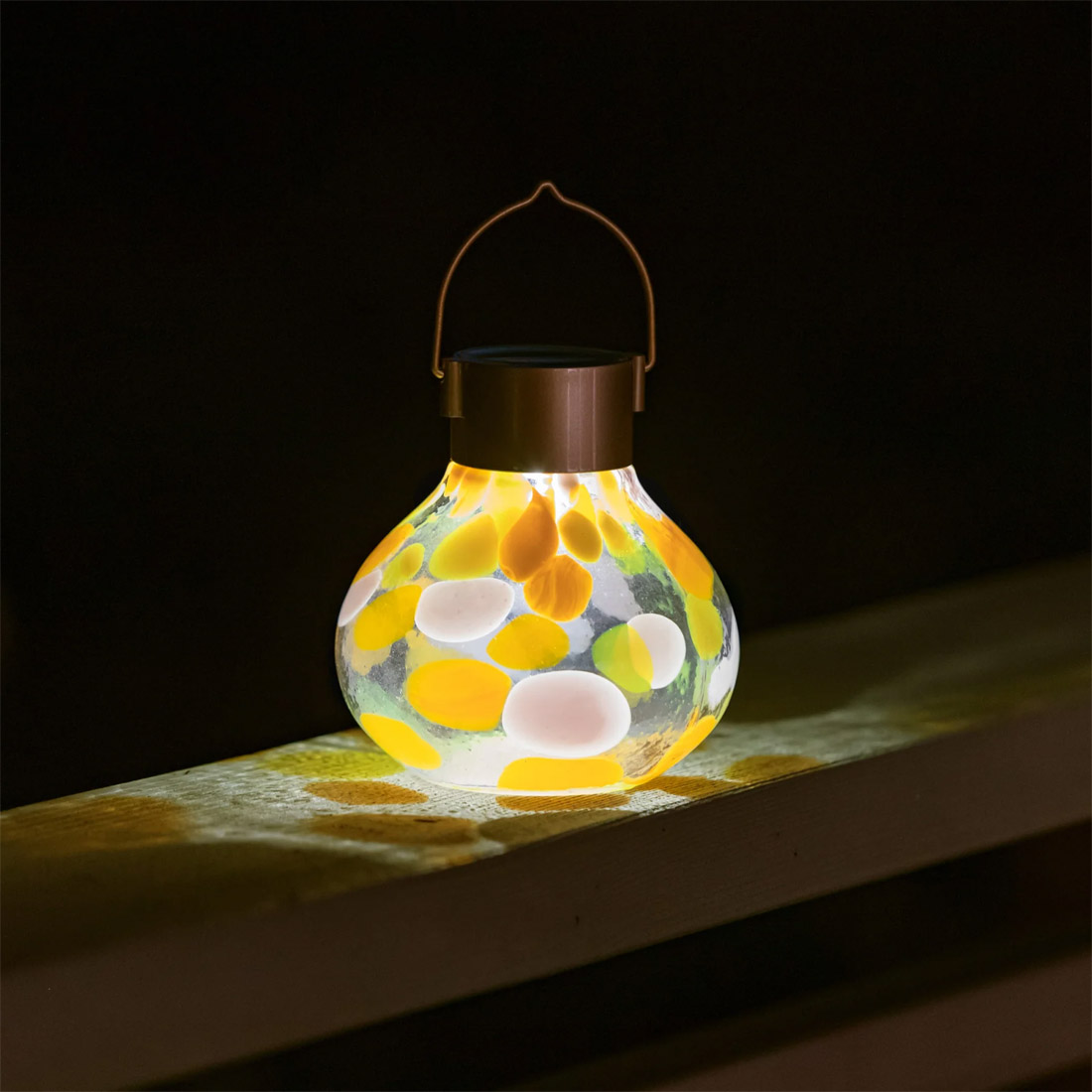 Infused with sunlight by day, this Solar Tea Lantern in Mai Tai yellow and orange tones comes alive at night, casting a soft radiance through hand-blown glass. Versatile and charming, these lanterns are designed to go wherever ambiance is needed. Tuck one among garden blooms, brighten a patio table, line a stairway, hang from a tree branch, or carry it in hand for a cozy nighttime stroll. Built-in solar panel with automatic dusk-to-dawn lighting. Weather-resistant design for year-round use. 5″ H x 4.5″ W