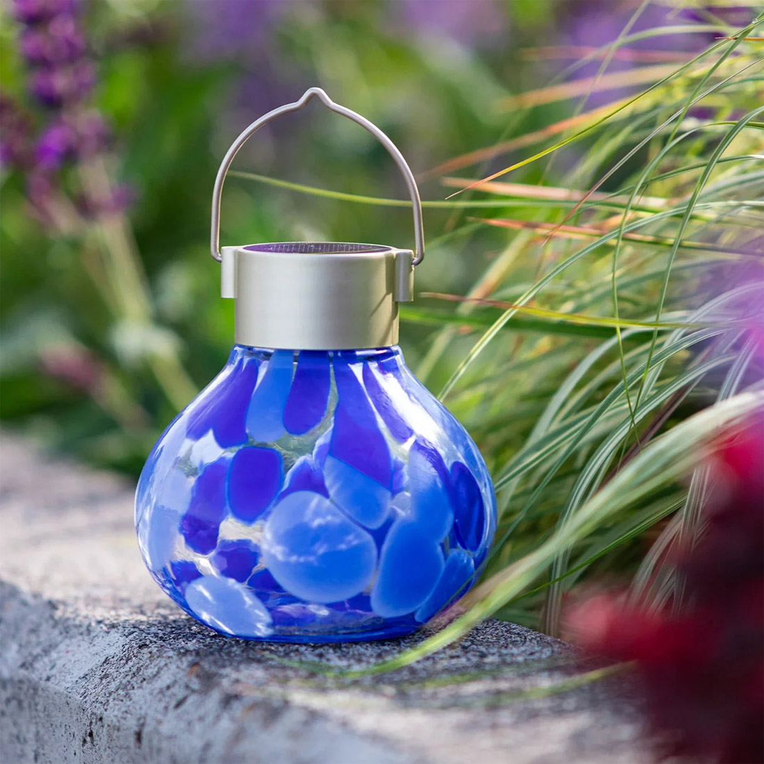 Infused with sunlight by day, this Solar Tea Lantern in periwinkle tones comes alive at night, casting a soft radiance through hand-blown glass. Versatile and charming, these lanterns are designed to go wherever ambiance is needed. Tuck one among garden blooms, brighten a patio table, line a stairway, hang from a tree branch, or carry it in hand for a cozy nighttime stroll. Built-in solar panel with automatic dusk-to-dawn lighting. Weather-resistant design for year-round use. 5″ H x 4.5″ W