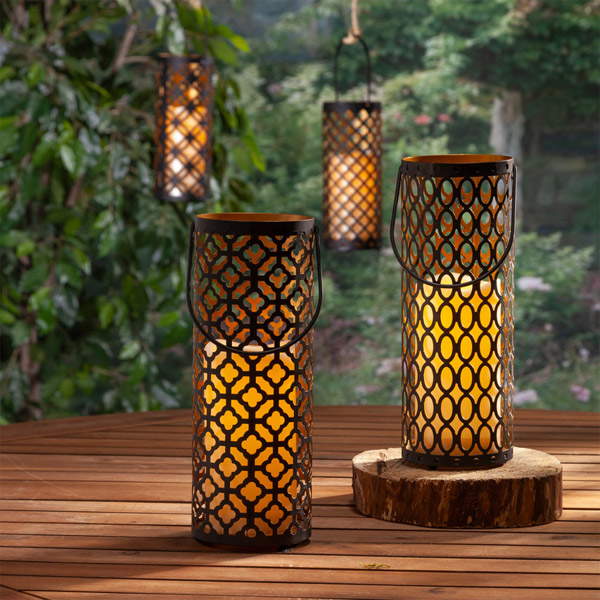This cylindrical black metal lantern features a laser-cut design revealing a gold-finish interior and included LED candle. Metal handle. Measures 3.75"D x 10"H. Requires 3 AAA batteries, not included. Sold individually. Various styles.