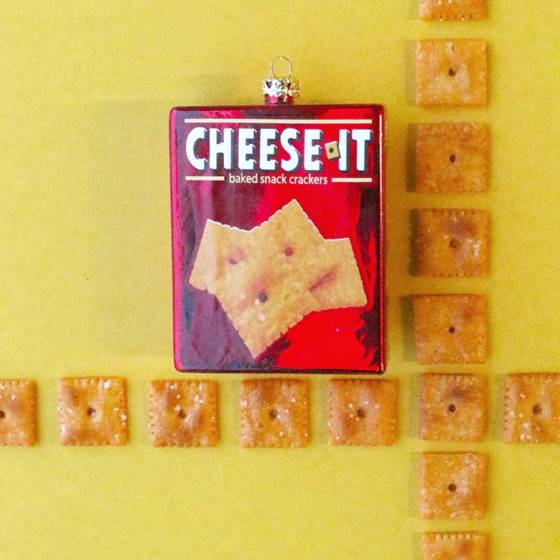 Who doesn't love this classic baked cheese cracker! Celebrate this favorite snack with this glass Cheese It ornament. 2.5"L x 1"W x 3.5"H