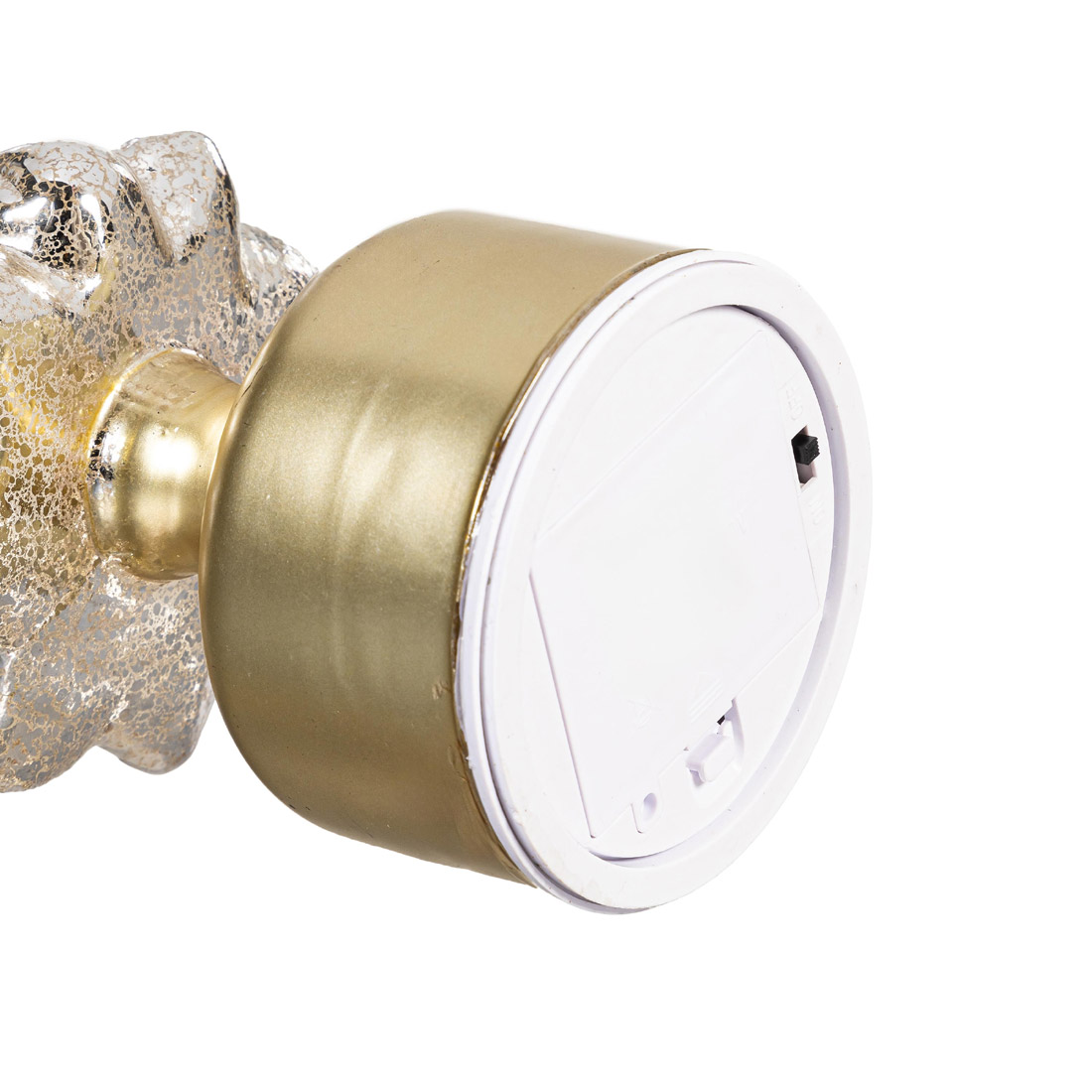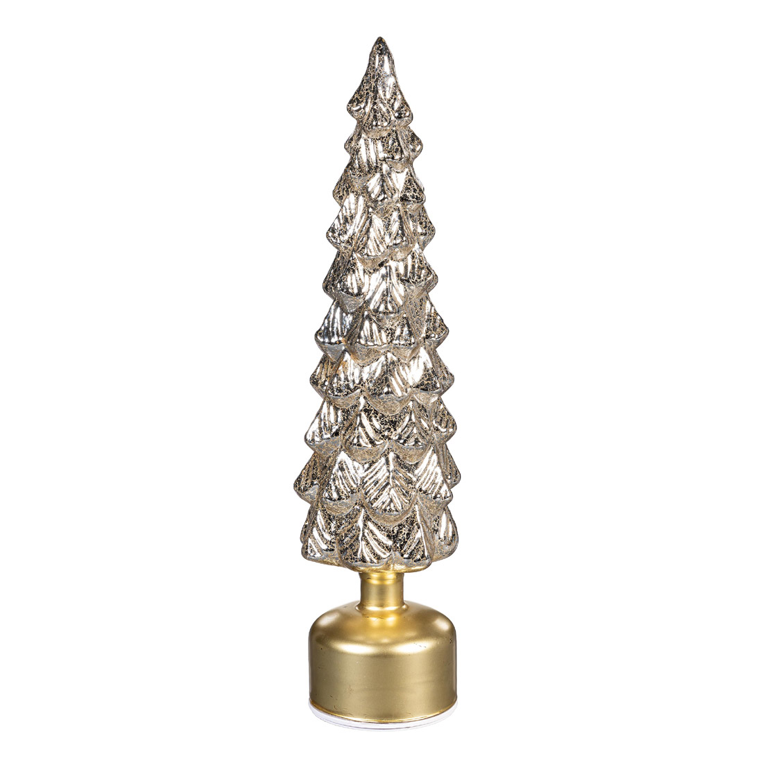 Create a warm and inviting ambiance this season with this amazing lighted, rotating silver glass Christmas tree. The entire tree spins, while tiny LED lights twinkle within. Designed to complement any style, our versatile decorations add a touch of sparkle, joy, and sophistication to any holiday experience. Set it on the table, counter, or desk to show it off. Perfect for cozy winter evenings and beyond, this piece will ensure any table will feel truly special. Timer function with 6 hours on, 18 hours off. Requires 3 AA batteries, not included. 4"D x 16"H
