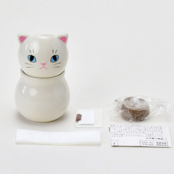 The sweet and grumpy Corocoro Cat has a head that can be tilted to change its look. While the head moves around, the attached wick soaks up water from the cat's body and automatically waters the plant. The kit includes seeds, growing media, and instructions. Seed varieties may be one of wild strawberry, sweet basil, or peppermint. Sold individually. Includes 1 cat kit. Color, style, and seed variety will vary.