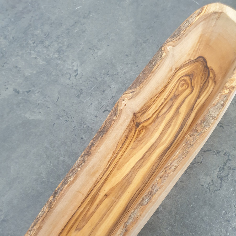 This long vessel is made of olive wood from the Mediterranean region and features an organic shape with a live edge. Each piece is unique and one of a kind! Approx 12"L x 2"W
