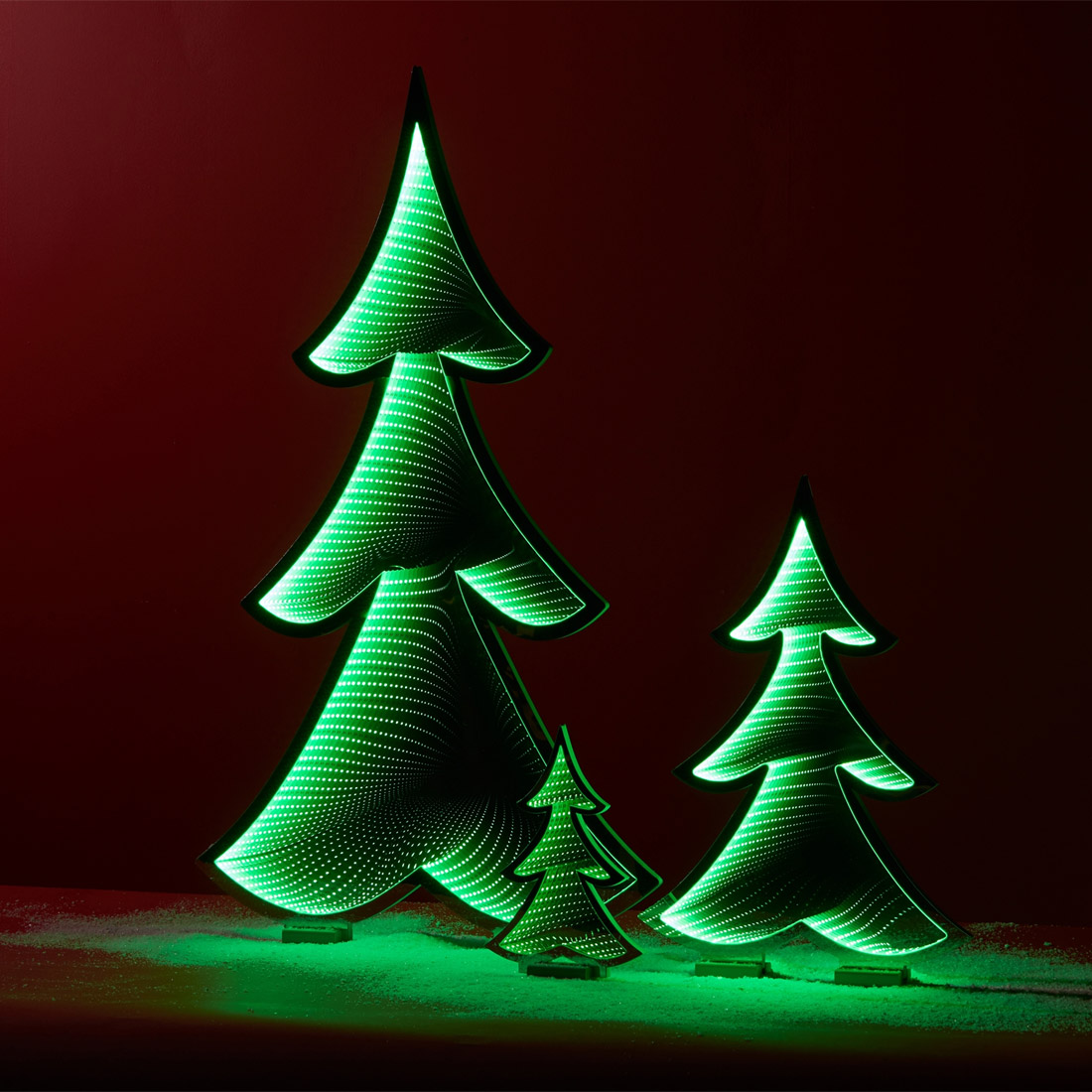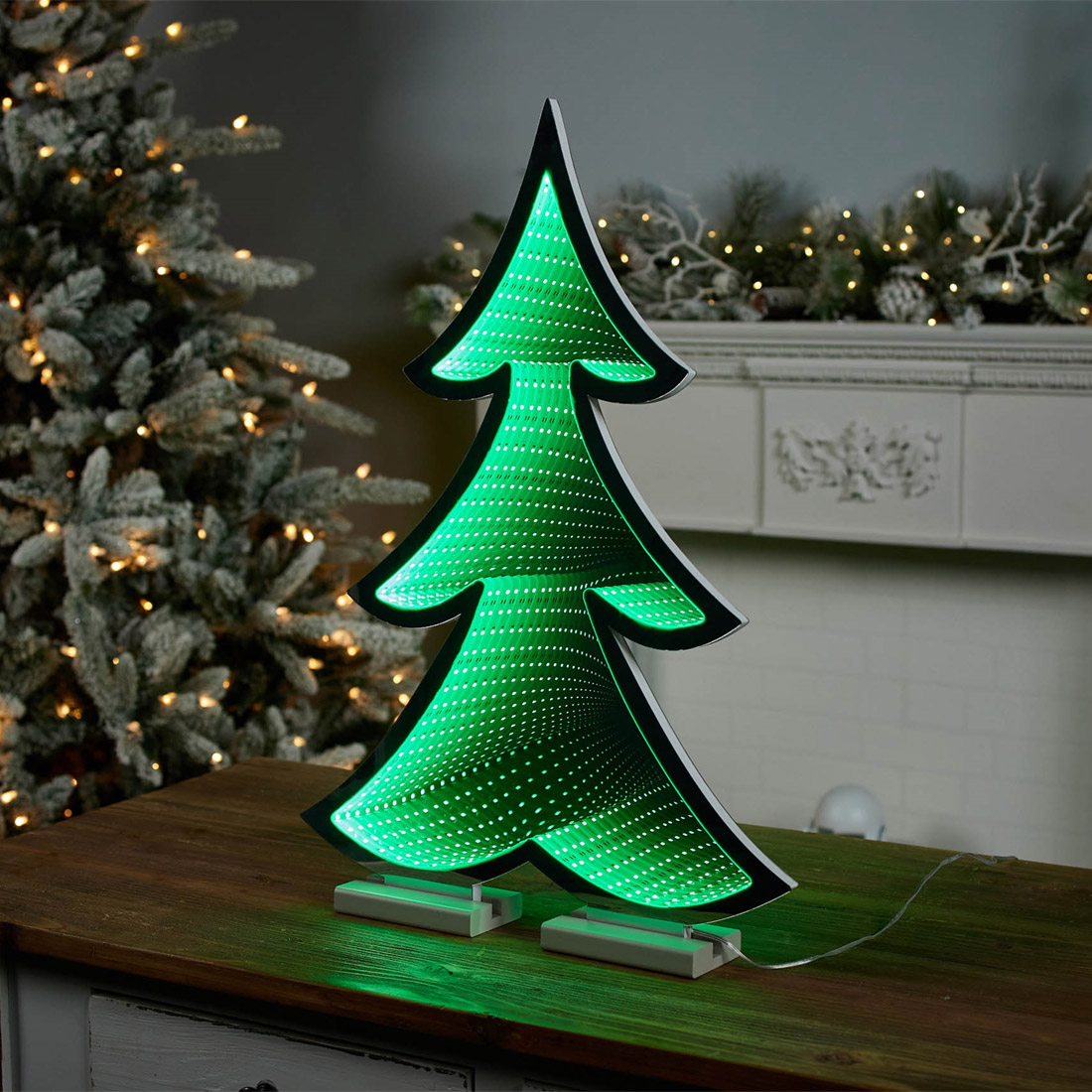 Light up the holidays with this mesmerizing Christmas Tree Infinity Light. The endless tunnel of lights adds elegance to every holiday setting while the whimsical Christmas Tree silhouette adds character. The display is aglow with green LED lights, visible from both sides of the piece. Features vibrant LED illumination. UL Plug Included. For indoor or protected outdoor use. By Ekkolight. 23.5"H