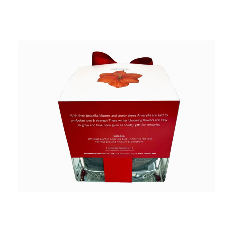 These winter blooming flowers are easy to grow and have been given as holiday gifts for centuries. The Amaryllis Winter Garden Kit includes cast glass planter, amaryllis bulb (Amaryllis red lion), soil-less growing medium and directions. Once planted, amaryllis bloom time is 6-12 weeks.