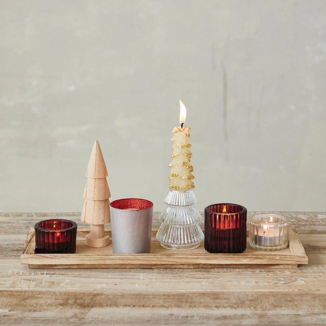 This wood tray comes complete with 2 glass votive holders, 2 glass tealight holders, a tree-shaped glass taper candle holder, and a decorative wood tree. This set creates an instant centerpiece for any table or mantel! Tray measures 14"L. Set of 7. Sold without candles.