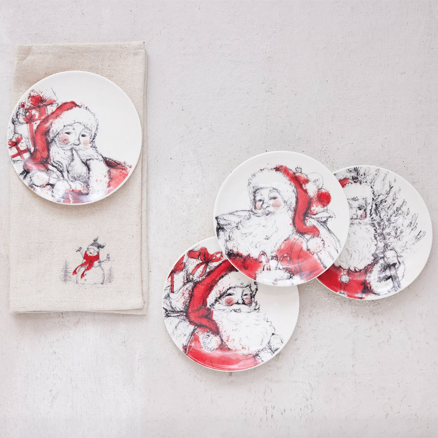This retro-inspired stoneware plate features a red, black and white Santa image. Perfect for holiday parties or everyday use throughout the holidays. The 8-inch diameter makes this plate and ideal size for appetizers or small meals. Assorted 1 piece, style will vary. 8"D