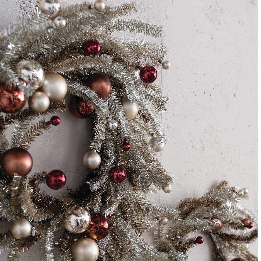 This round Tinsel Wreath with Ornaments is a nod back to a mid-century Christmas. The silvery and gold tinsel features multicolor ornaments. 24"D