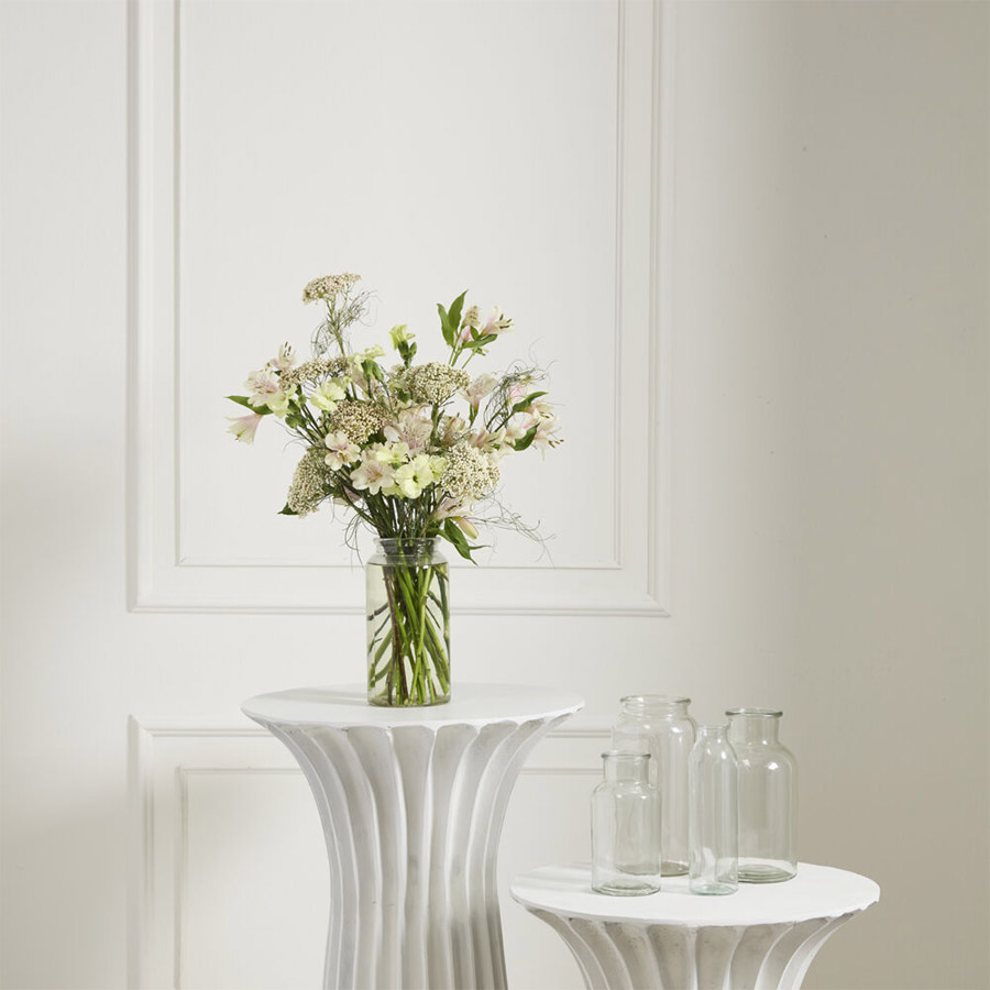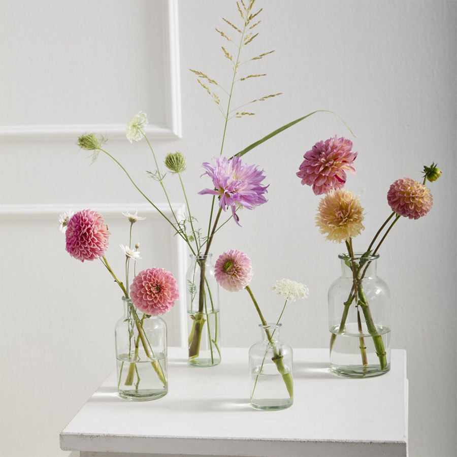 The simple glass budvase Billie Bottle is machine-made for an affordable and beautiful piece, perfect for displaying blooms or stems all year long. 4"D x 8"H. 3" Opening.